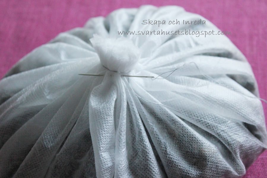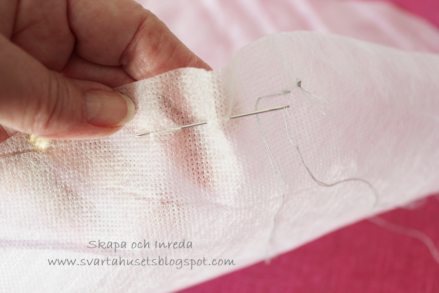 med upp till mitten av vingen.Lämna en lång tråd ca 70 cm på den ena vingen, den använder man till att sy de