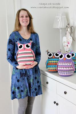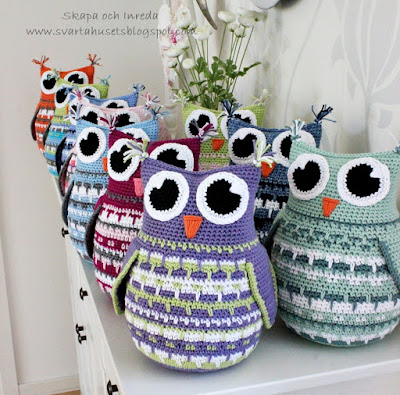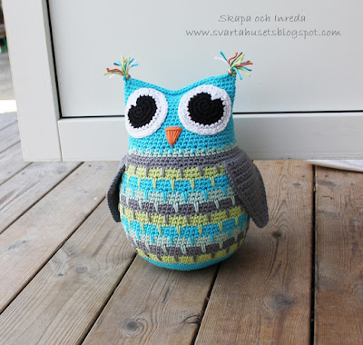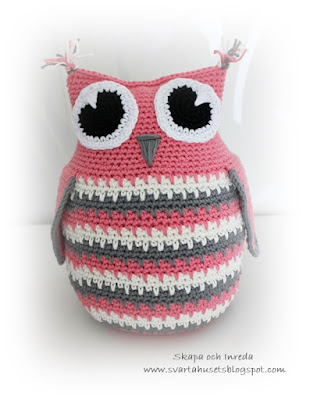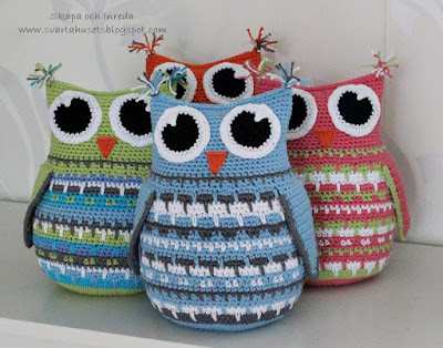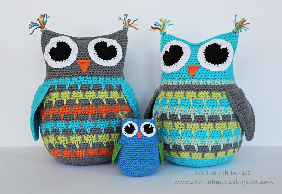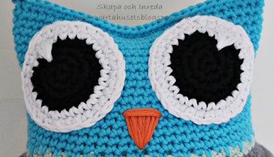 som du vill ha dem. Sy fast ögonen och brodera en liten näbb. Fyll ugglan med vadd, virka ihop ugglan
